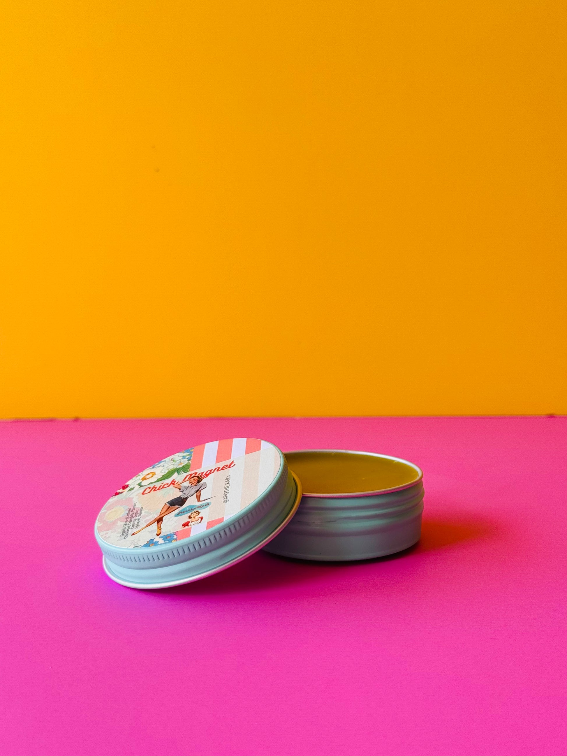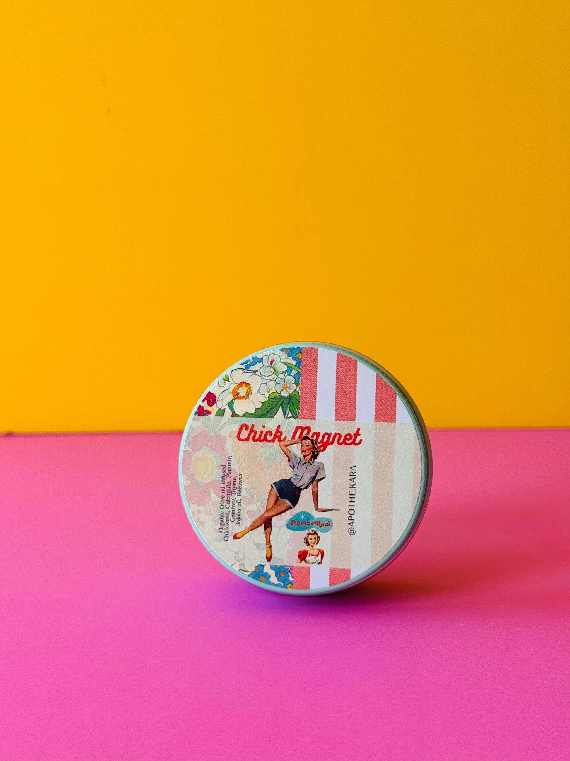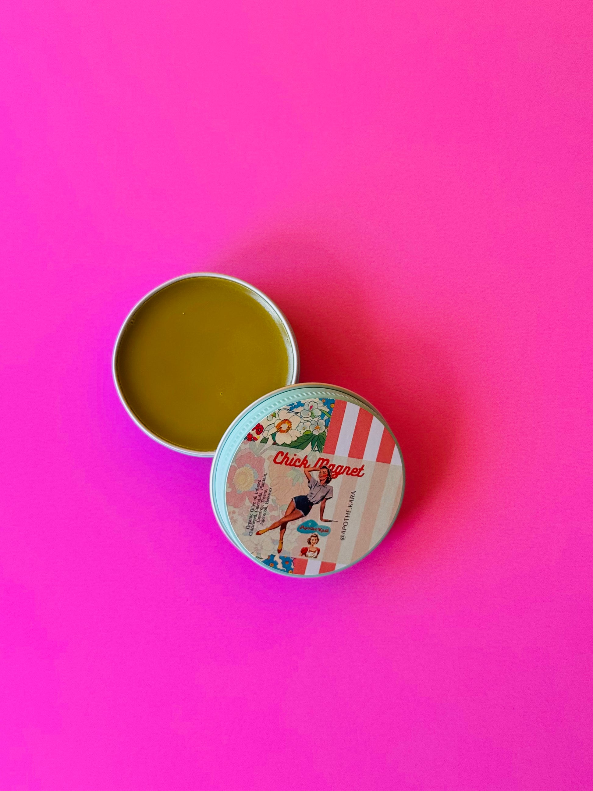 Chick Magnet Ingredients: Organic EVOO, Chickweed, Calendula, Plantain, Comfrey, Thyme, Jojoba oil, Beeswax