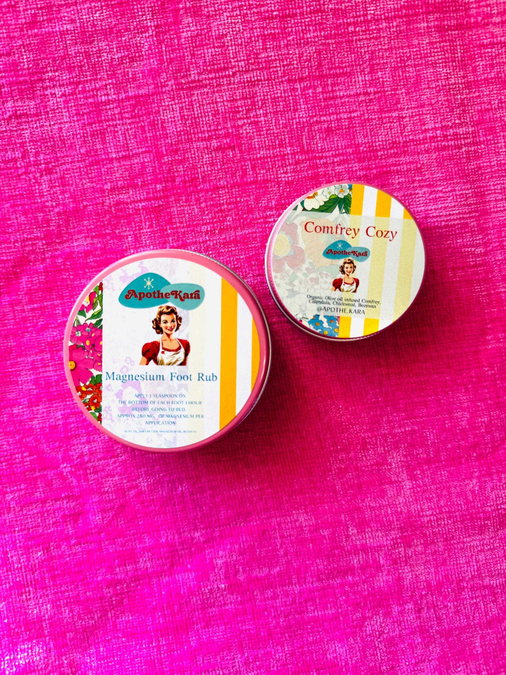 The perfect Valentine gift! My two best selling items all packaged up DARLING in a cute little drawstring muslin bag! MAGNESIUM FOOT RUB and COMFREY COZY!